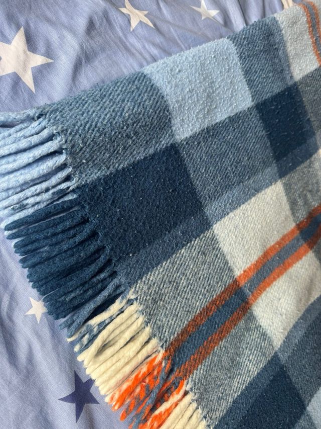 Manta de lana a cuadros azul y naranja