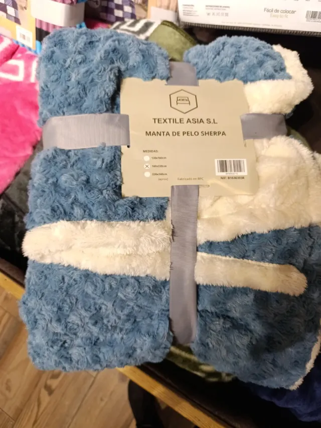 Manta de pelo sherpa con un diseño de rayas en azul y blanco. Es suave y cálida. - Material: Pelo sherpa. - Medidas: 130x160cm.