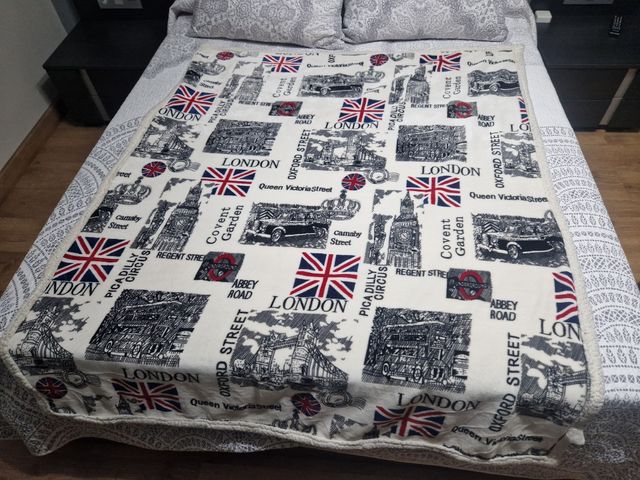 Manta de sofá, de tejido de borrego, con motivos de Londres. medidas 150x126 cm.