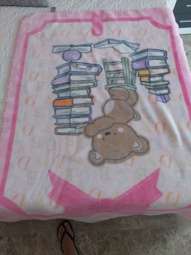 Detalles del productoPreciosa manta infantil de la marca Mora. Es suave y de color rosa, con un diseño de un oso y libros. Ideal para bebés y niños pequeños.