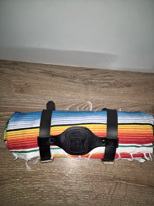 Detalles del productoManta de estilo mexicano enrollada y sujeta con correas de cuero.