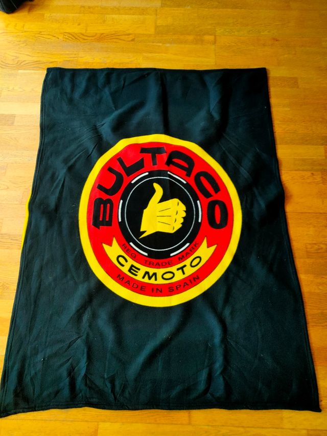 Preciosa manta de forro polar con el logo de Bultaco. Ideal para los amantes de las motos clásicas. Tamaño 1.60 x 11.5