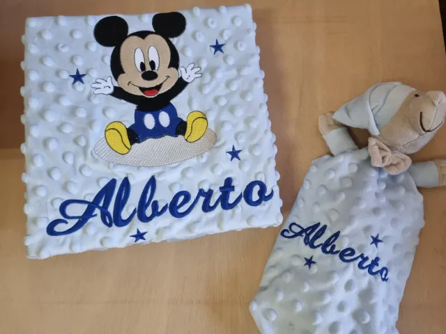 Conjunto de manta y doudou con el nombre Alberto bordado. Se puede elegir color de manta , muñeco , color de letras y estilo de dibujos al gusto !
