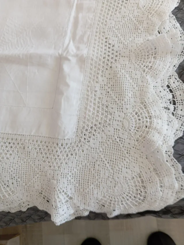Detalles del productoElegante mantel antiguo de lino blanco, completamente hecho a mano.