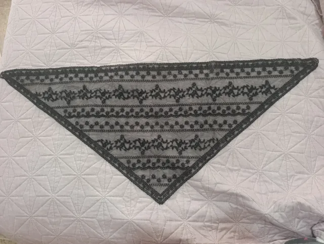 Preciosa manteleta de encaje negro, perfecta para trajes regionales. - Diseño triangular. - Adorno de flores y detalles. - Borde festoneado.