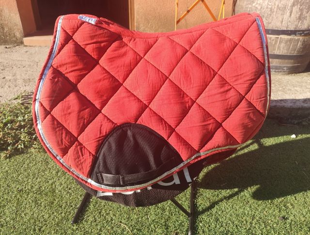 Mantilla de salto roja en buen estado. Equitheme infinity - Color rojo. - Diseño acolchado. - Ribete plateado.