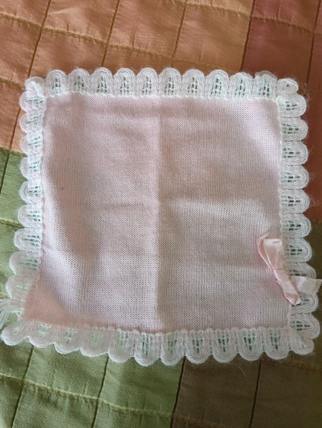 Mantita para muñeca Barriguitas o similar, de color rosa y con un bordado. está impoluta, salvo por un pequeño descosido en una esquina.