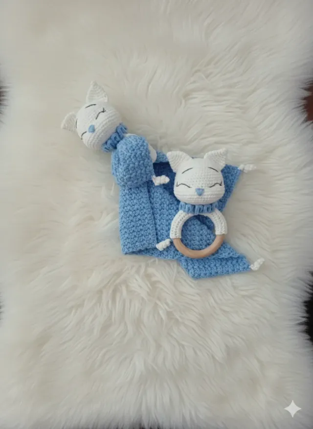 Detalles del productoConjunto de mantita de apego y sonajero con forma de gato, ambos hechos a crochet.