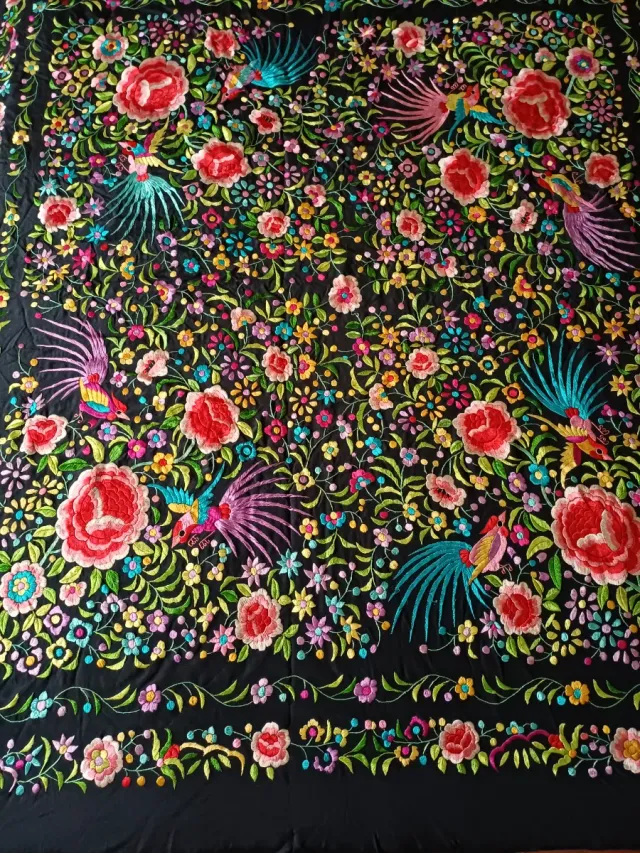 Manton de Manila bordado flores y aves hilo seda