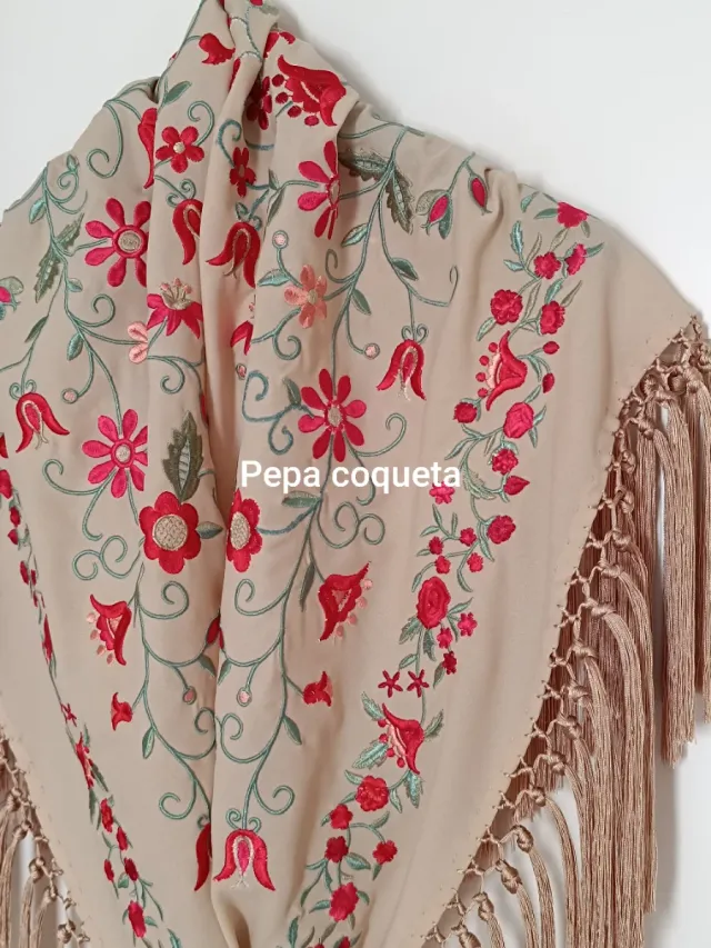 Mantoncillo bordado flores rojo y marfil
