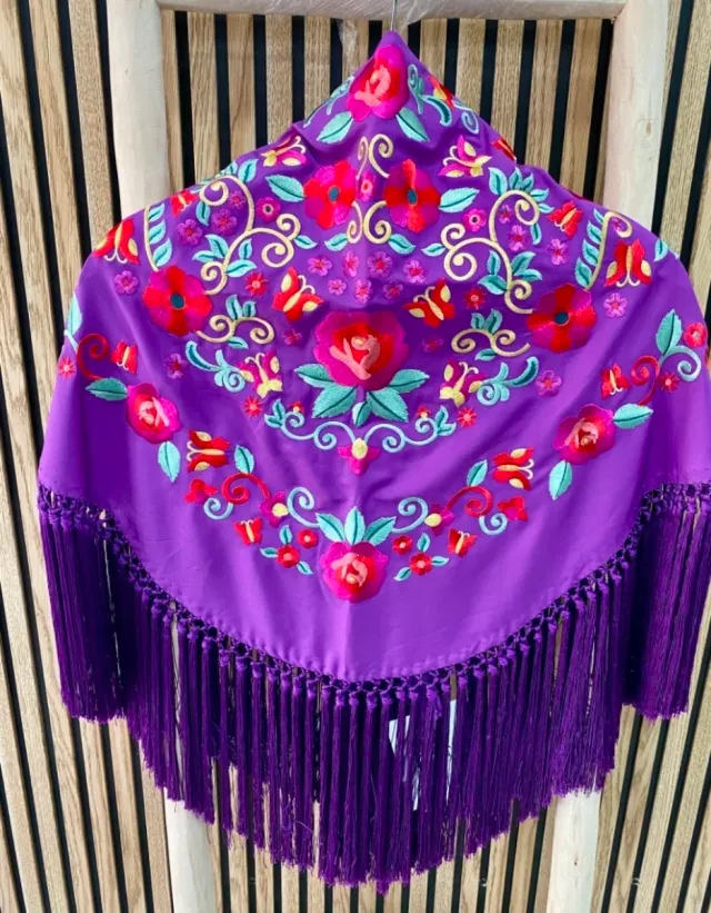 Mantoncillo de flamenca con un diseño floral bordado y flecos.
