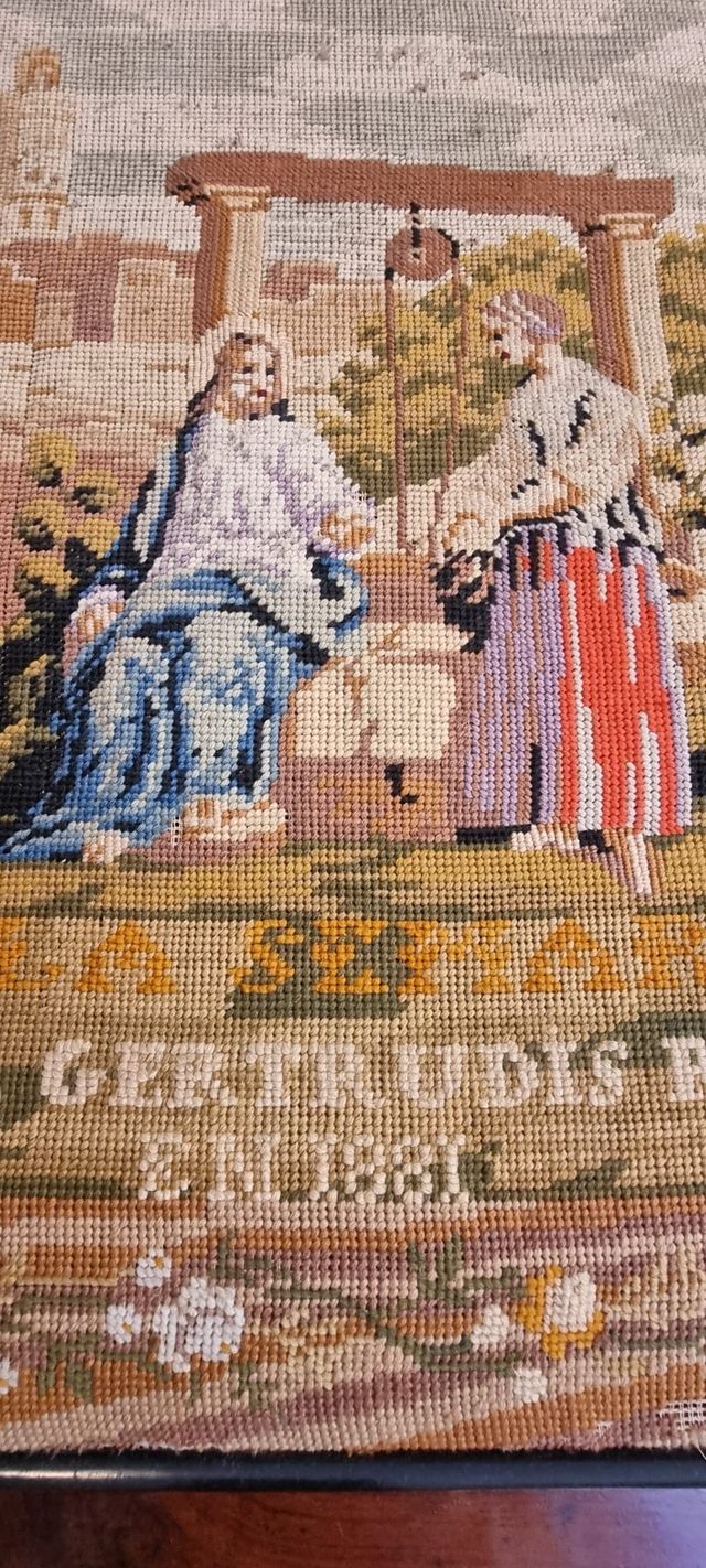 Detalles del productoPreciosa manualidad realizada a medio punto, datada en el año 1881. Representa una escena bíblica con dos figuras junto a un pozo.