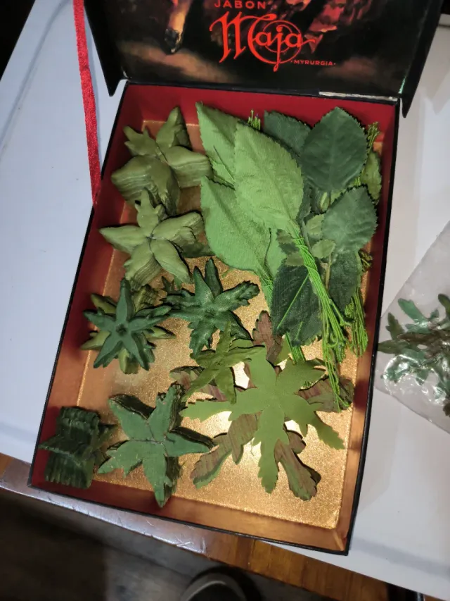 Set de hojas y flores artificiales para manualidades. - Hojas de diferentes tamaños y formas. - Flores verdes con detalle. - Ideal para proyectos creativos.