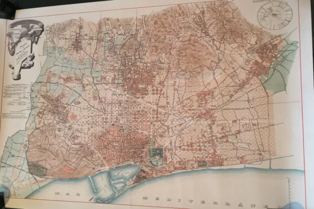 Un maravilloso mapa antiguo, coloreado a mano y raro de Barcelona, originalmente elaborado en 1891 por D. J. M. Serra y publicado por las autoridades municipales.