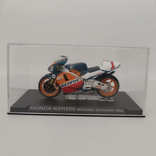 Detalles del productoRéplica detallada de la moto Honda NSR500, pilotada por Michael Doohan en 1998. Presentada en una vitrina protectora.