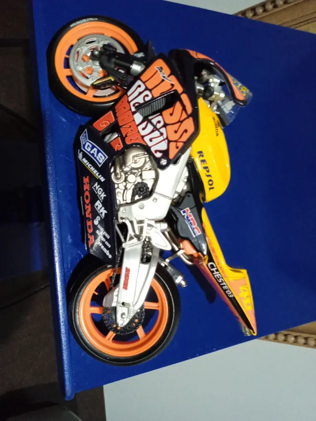 Detalles del productoRéplica detallada de la moto Honda Repsol, utilizada por Valentino Rossi.