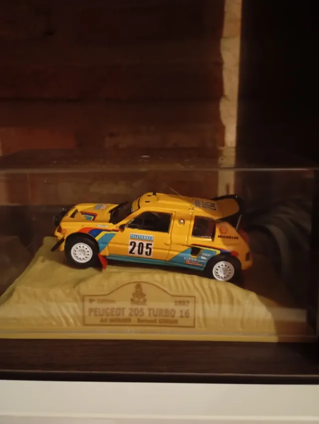 Réplica detallada del Peugeot 205 Turbo 16, ganador del Rally Dakar. - Modelo a escala 1:43. - Base expositora conmemorativa. - Decoración de competición.