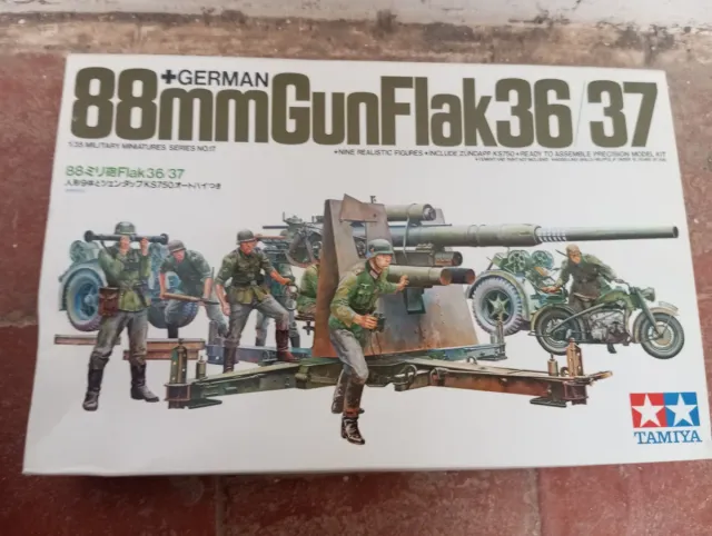 Detalles del productoMaqueta de plástico a escala 1/35 del cañón antiaéreo alemán 88mm Flak 36 37 de Tamiya. Incluye figuras realistas y una motocicleta.