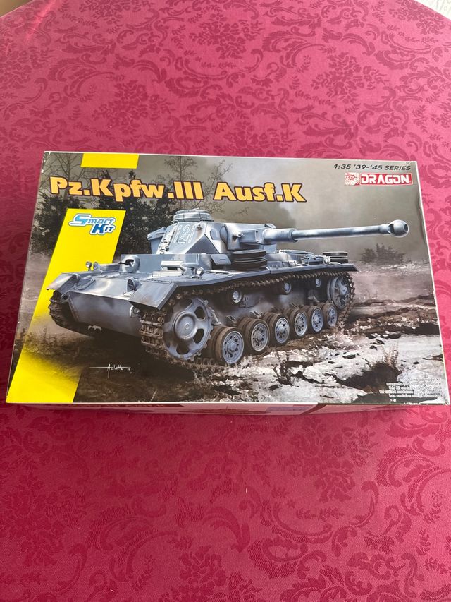 Detalles del productoMaqueta a escala 1:35 del tanque Pz.Kpfw.III Ausf.K de la serie '39-'45 de Dragon. Modelo 6903. Incluye partes transparentes, calcas, fotograbados, cadenas con eslabones individuales e instrucciones. Tanque híbrido, con casco de panzer III y torreta de panzer IV.