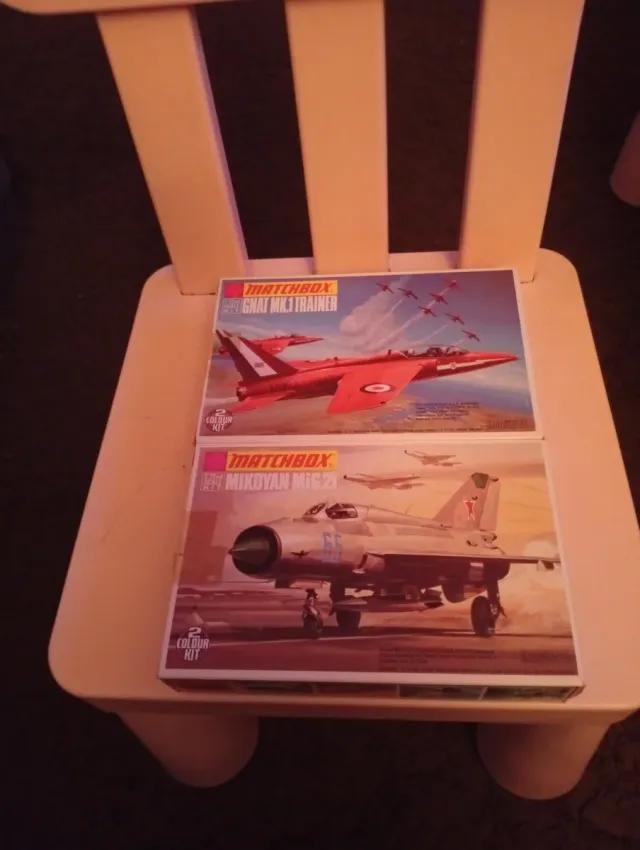 Dos maquetas de aviones de la marca Matchbox. - Kit 1: GNAT MK.1 TRAINER. - Kit 2: MIKOYAN MIG 21. - Ambos son kits de montaje de color.