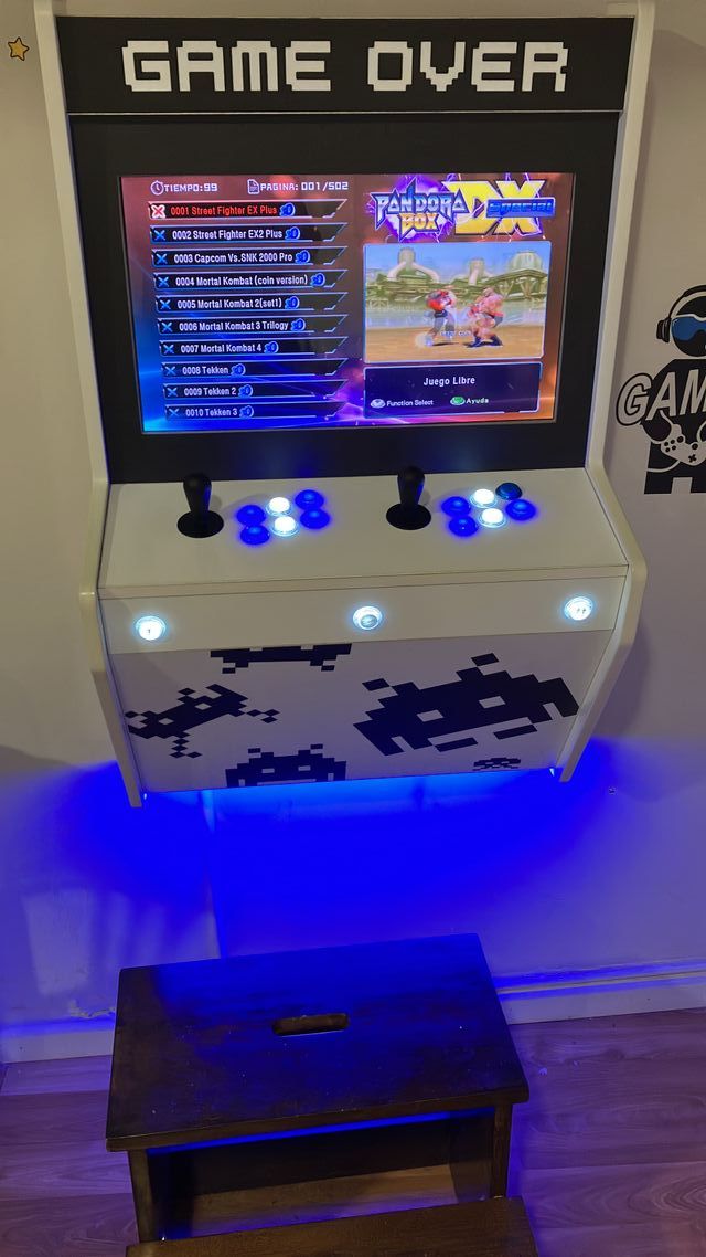 - Máquina arcade con diseño personalizado y luces LED. - Pantalla de alta definición 22" - Controles duales con joysticks y botones. - Diseño temático de Space Invaders en los laterales. - Iluminación LED azul inferior. - 5000 juegos