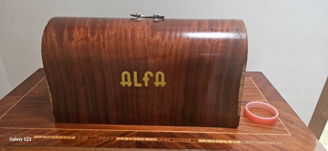 Máquina de coser de la marca Alfa, con un diseño clásico y elegante. - Estuche de madera con asa. - Detalle del logo ALFA en la parte frontal
