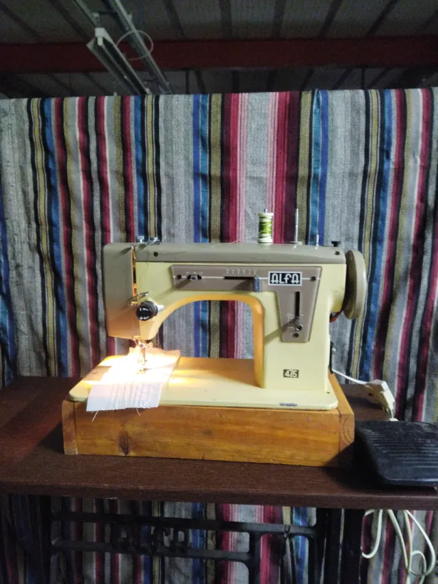 Máquina de coser Alfa modelo 415, ideal para trabajos de costura. - Incluye motor y pedal. - Permite puntada recta y zigzag.