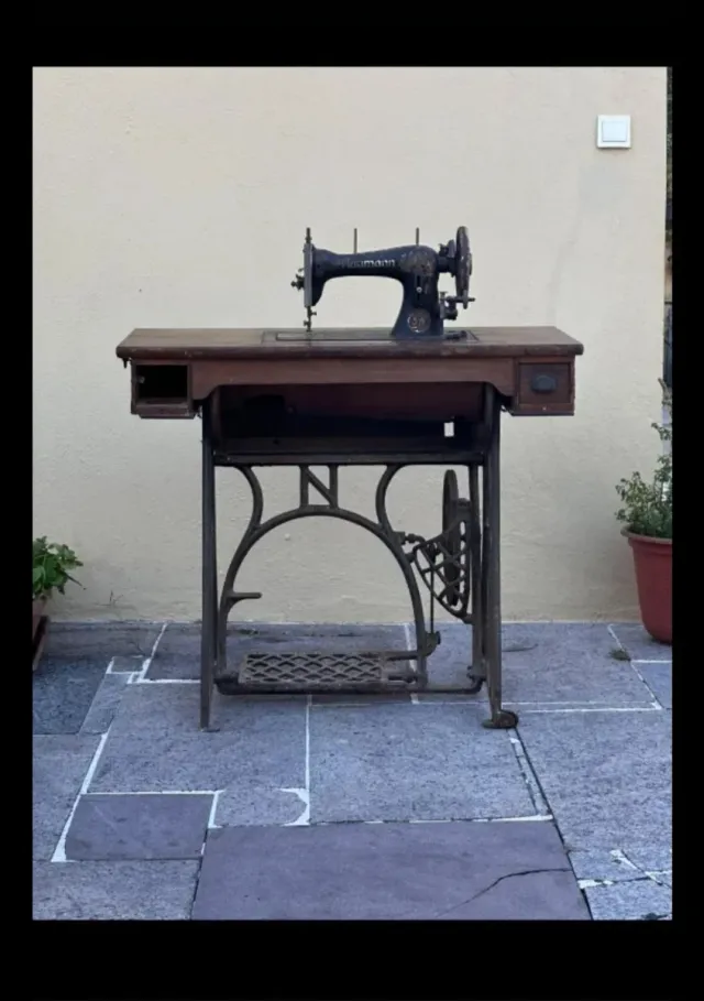 Detalles del productoMáquina de coser antigua de la marca Hauman, con su mueble y pedal.