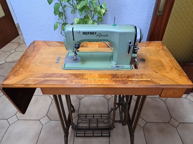 Detalles del productoMáquina de coser antigua (años 70) con pedal de forja, marca REFREY, modelo PREFERIDA. Medidas del producto