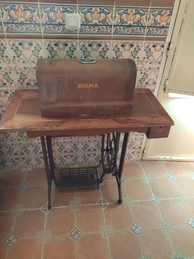 Máquina de coser antigua de la marca SIGMA, en buen estado. - Diseño clásico. - Incluye su tapa protectora de madera. - Base de hierro fundido con pedal.