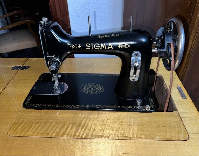 Detalles del productoMáquina de coser antigua de la marca SIGMA, modelo Elgoibar-España. Su diseño clásico en color negro le da un toque vintage.
