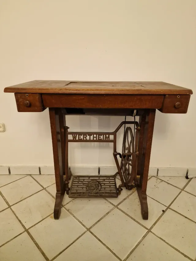 Máquina de coser de pedal marca Wertheim. La madera tiene carcoma, pero se puede aprovechar la máquina o el pie de hierro.