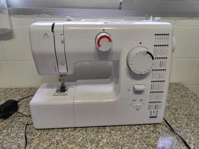 Detalles del productoMáquina de coser de color blanco, ideal para trabajos de costura en casa. Cuenta con varios diseños de puntada preestablecidos.