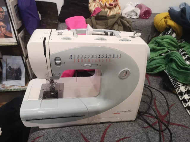 Máquina de coser Bernette en buen estado. - Diseño compacto y moderno. - Panel de control con selección de puntadas