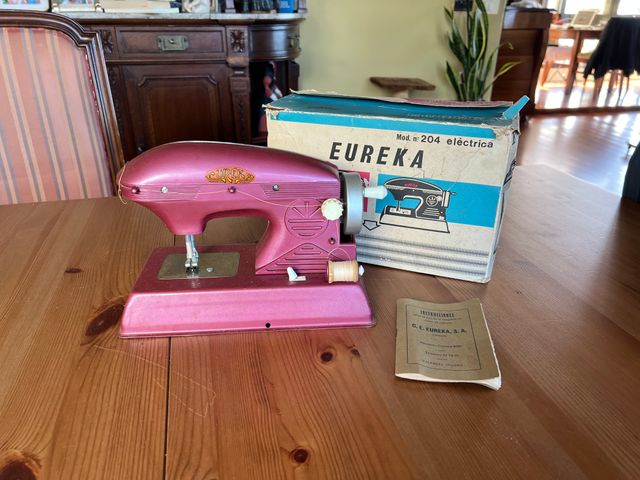 Detalles del productoAntigua m ́aquina de coser de juguete marca Eureka. Es del año 1969. Es el ́ectrica, funciona con pilas. Estado impecable, con la caja original y manual de instrucciones