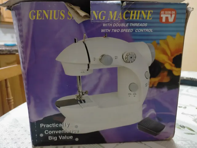 Máquina de coser portátil con doble hilo y dos velocidades. - Diseño compacto. - Incluye pedal. - Ideal para trabajos sencillos.
