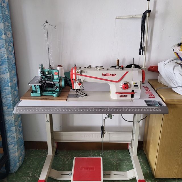 Máquina de coser overlock industrial de color verde. - Ideal para acabados profesionales. - Incluye soporte para hilo.