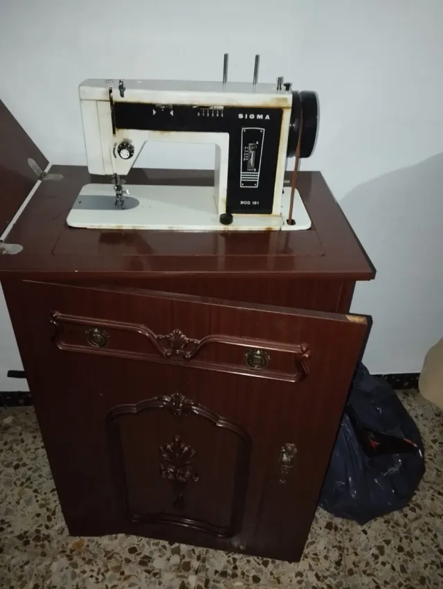 Máquina de coser Sigma modelo 161, ideal para trabajos de costura. - Diseño clásico en color blanco y negro.