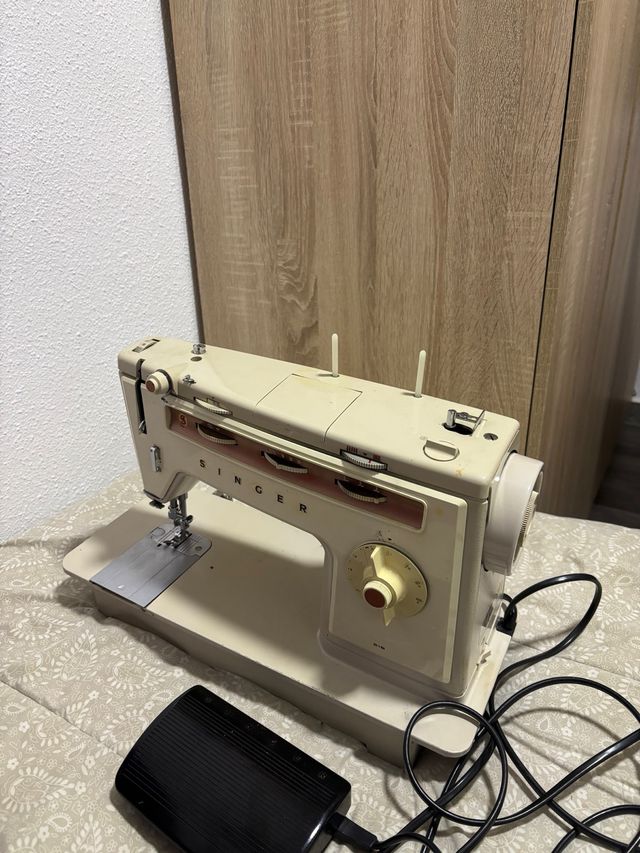 Máquina de coser Singer de color crema. - Incluye pedal. - Diseño clásico.