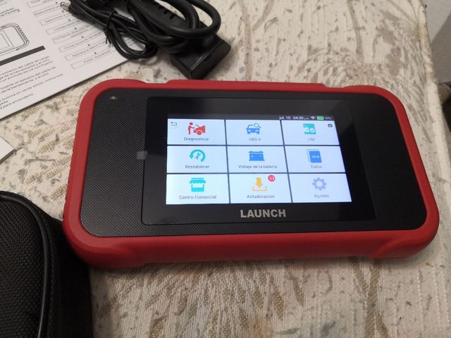 - Interfaz intuitiva con varias funciones como Diagnosticar, OBD II, I/M, Restablecer, Voltaje de la batería, Datos, Centro Comercial, Actualización y Ajustes.