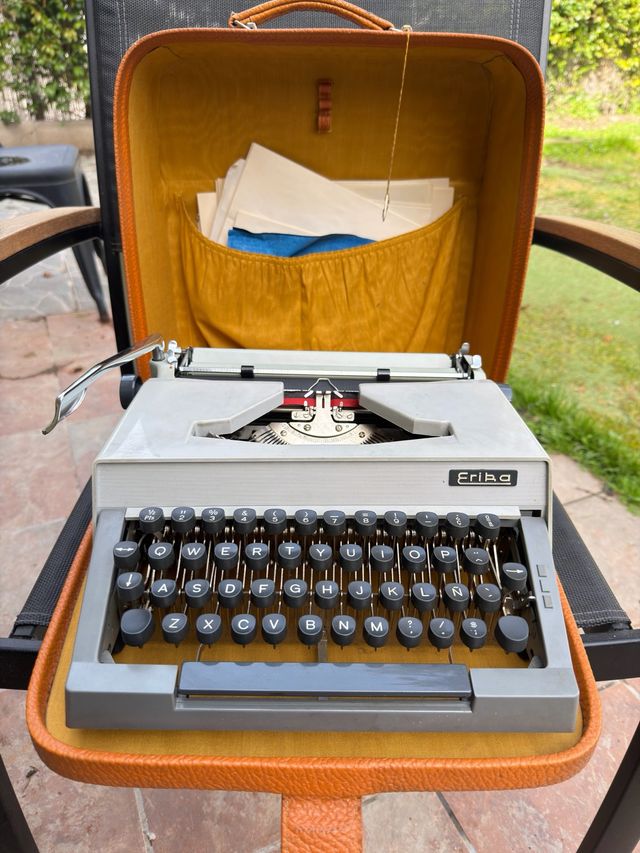 Detalles del productoMáquina de escribir portátil de la marca Erika, ideal para coleccionistas o como elemento decorativo.