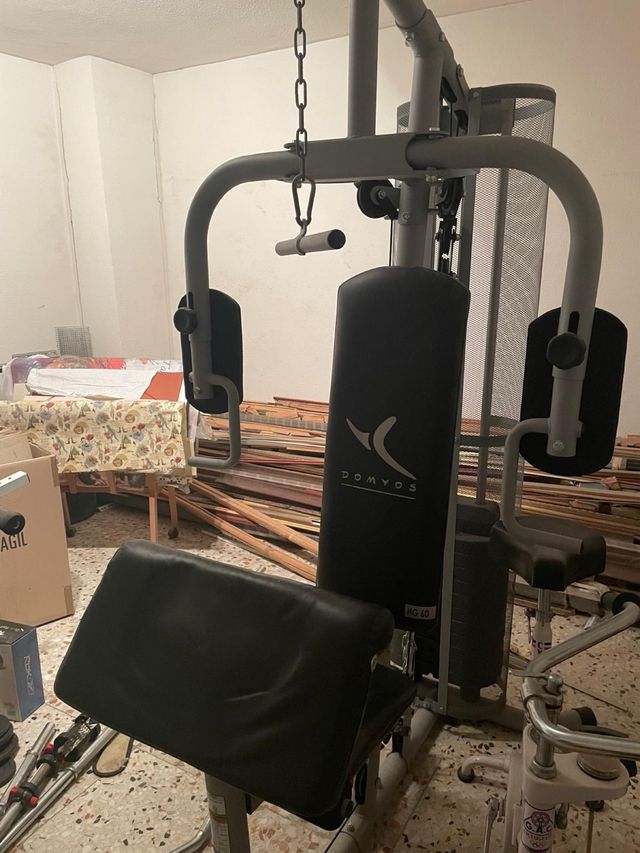 Máquina de gimnasio Domios HG 60 en color gris y negro. - Estructura metálica. - Asiento y soportes acolchados. - Poleas y cadena para ejercicios.