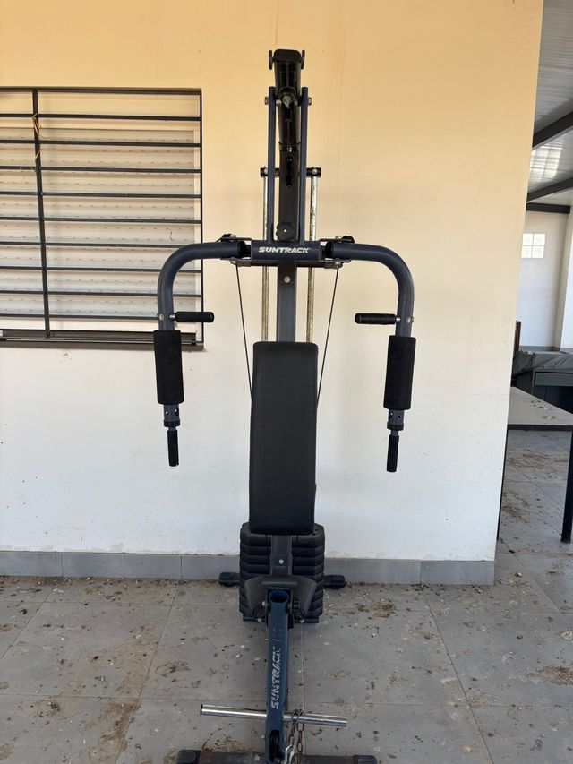Máquina de gimnasio multifuncional Suntrack. - Estructura robusta de color gris. - Asiento acolchado negro. - Barras de pesas apiladas. - Puños de agarre con acolchado.