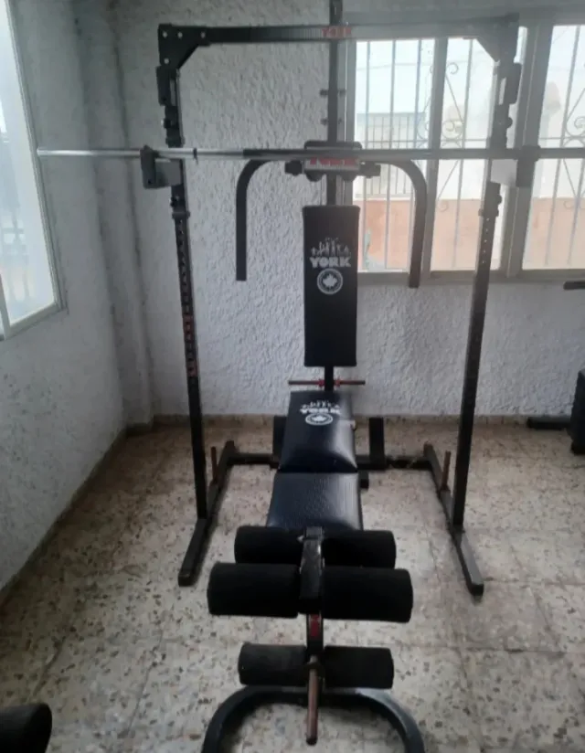 Se vende máquina de gimnasio multifuncional de la marca York. - Incluye barra. - Banco acolchado. - Soporte para pesas. Precio negociable
