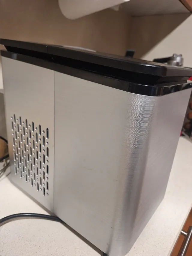 Máquina de hielo de la marca Bermax con acabado plateado y detalles en negro.