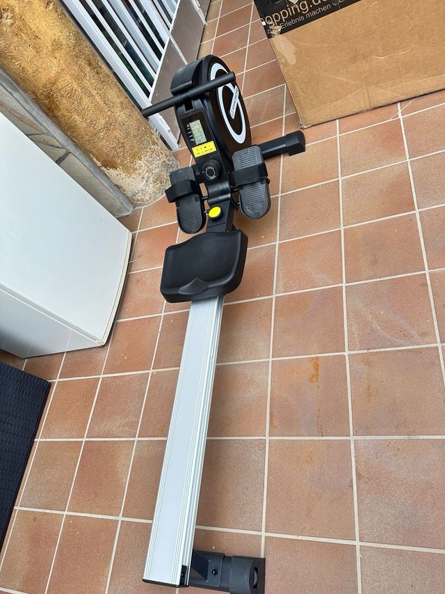 Máquina de remo para entrenamiento en casa. - Diseño plegable para fácil almacenamiento. - Pantalla digital para seguimiento de métricas. - Pedales ajustables con correas.