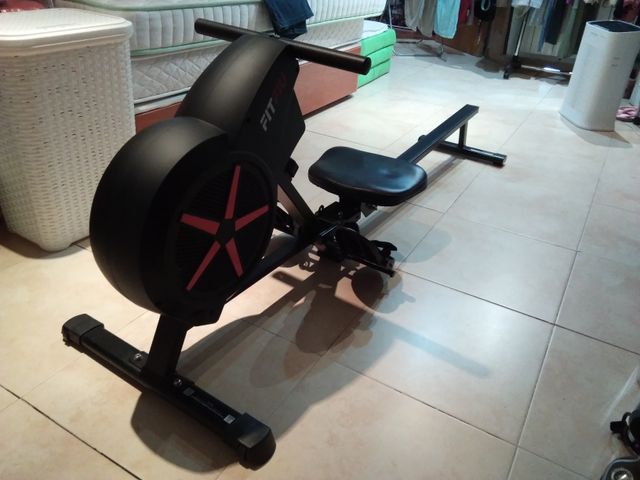 Detalles del productoMáquina de remo de resistencia por aire. 8 niveles de intensidad. Asiento acolchado. Pedales ajustables. Pantalla LCD con información a tiempo real de tiempo, número de brazadas y calorías. Plegable y con ruedas para transporte. En muy buen estado. No envío.