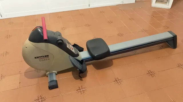 Máquina de remo Kettler Coach en color beige y gris. Buen estado y funcionamiento. Pequeño defecto en el display. 10 posiciones de fuerza. - Reposapiés ajustables.