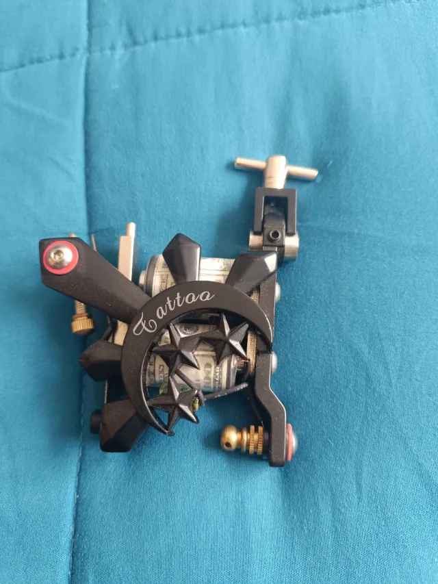 Máquina de tatuar profesional con un diseño único. - Color negro. - Decoración de luna y estrellas. - Incluye billetes de dólar como parte del diseño.
