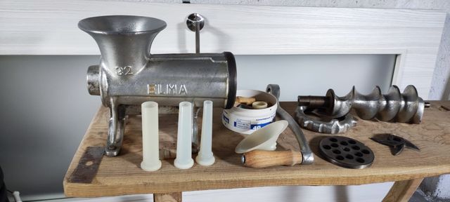 Máquina de picado y embutido ELMA con accesorios, instalada en un banco. Se regalan 2 bateas.